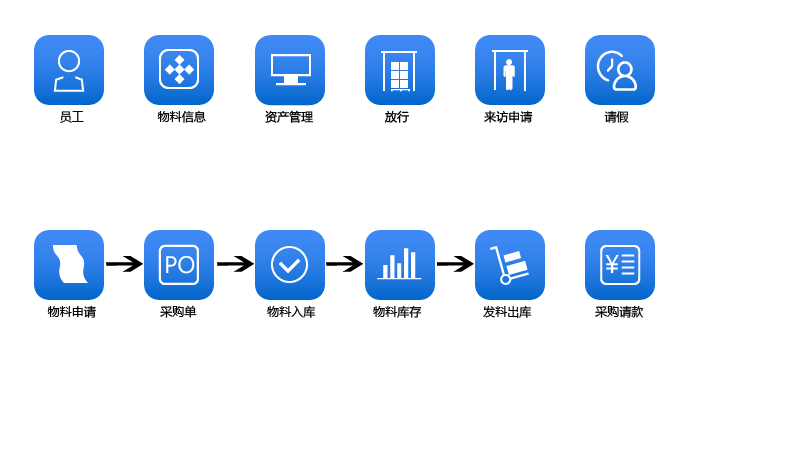 集成固定资产,休假,来访申请,货物放行管理,同时集成办公用品信息,申请,采购,库存及发放功能于一体。