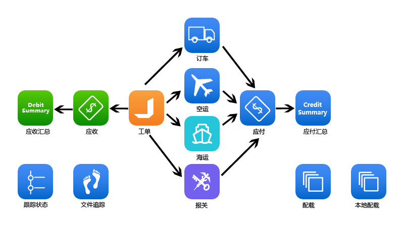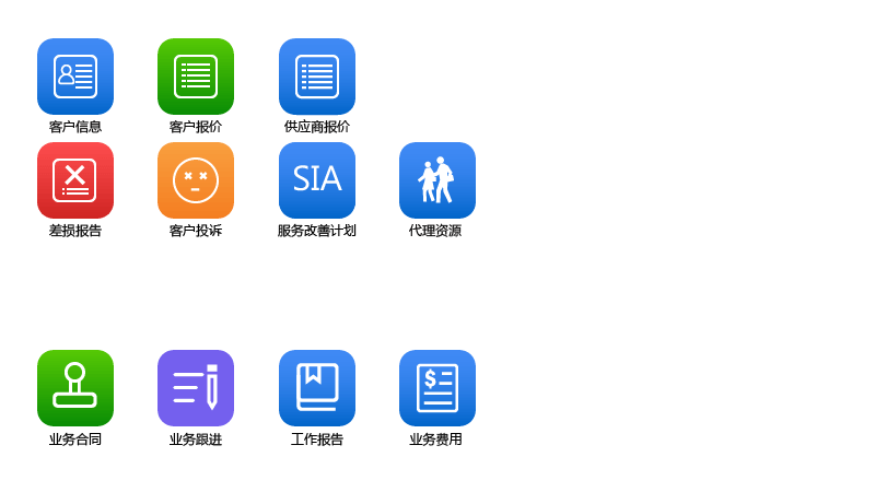 集成客诉管理,差损报告,服务提升报告,客户及供应商报价管理,代理资源管理,合同管理,业务跟进,工作报告,业务费用。